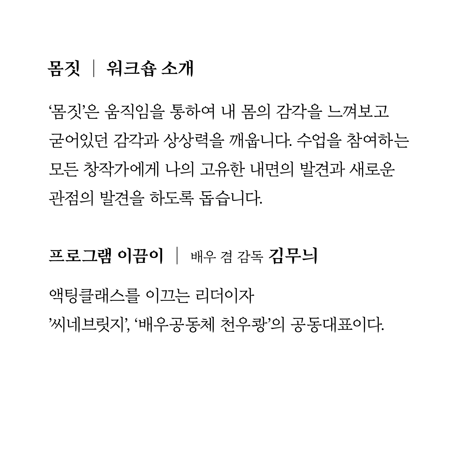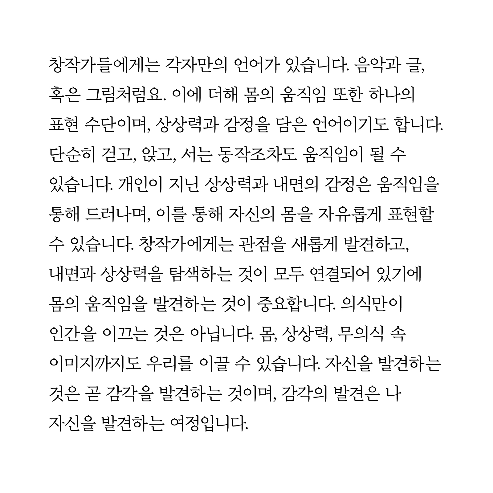 단순히 걷고, 앉고, 서는 동작조차도 움직임이 될 수 있습니다. 개인이 지닌 상상력과 내면의 감정은 움직임을 통해 드러나며, 이를 통해 자신의 몸을 자유롭게 표현할 수 있습니다. 창작가에게는 관점을 새롭게 발견하고, 내면과 상상력을 탐색하는 것이 모두 연결되어 있기에 몸의 움직임을 발견하는 것이 중요합니다. 의식만이 인간을 이끄는 것은 아닙니다. 몸, 상상력, 무의식 속 이미지까지도 우리를 이끌 수 있습니다. 자신을 발견하는 것은 곧 감각을 발견하는 것이며, 감각의 발견은 나 자신을 발견하는 여정입니다.